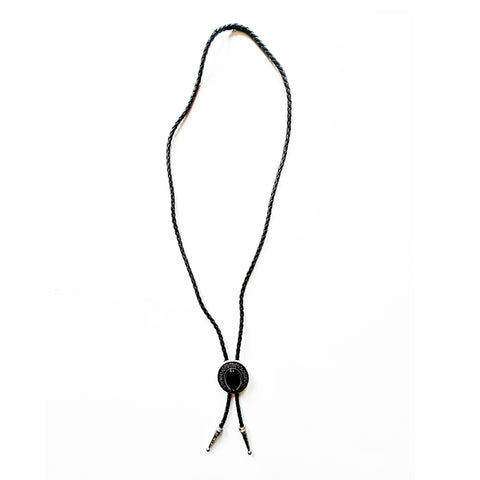 -Ornate Black Onyx Bolo Tie-Adjustable Black Leather braided cord-Unisex-Made in U.S.A.